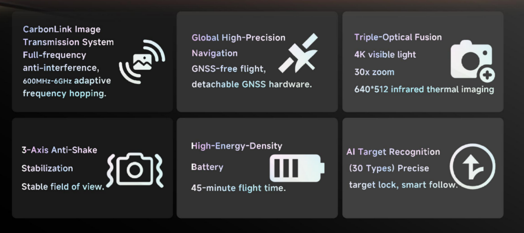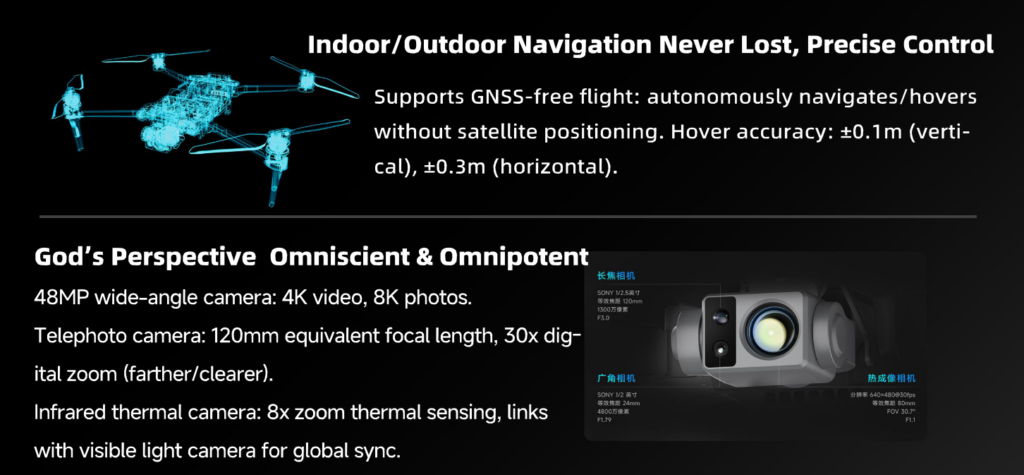 - ระบบการบินไร้สัญญาณดาวเทียม (GNSS-free flight): สามารถบินและลอยตัวรักษาระดับ (Hover) ได้อย่างแม่นยำแม้ในสภาพแวดล้อมที่ไม่มีสัญญาณดาวเทียม หรือถูกรบกวนสัญญาณ