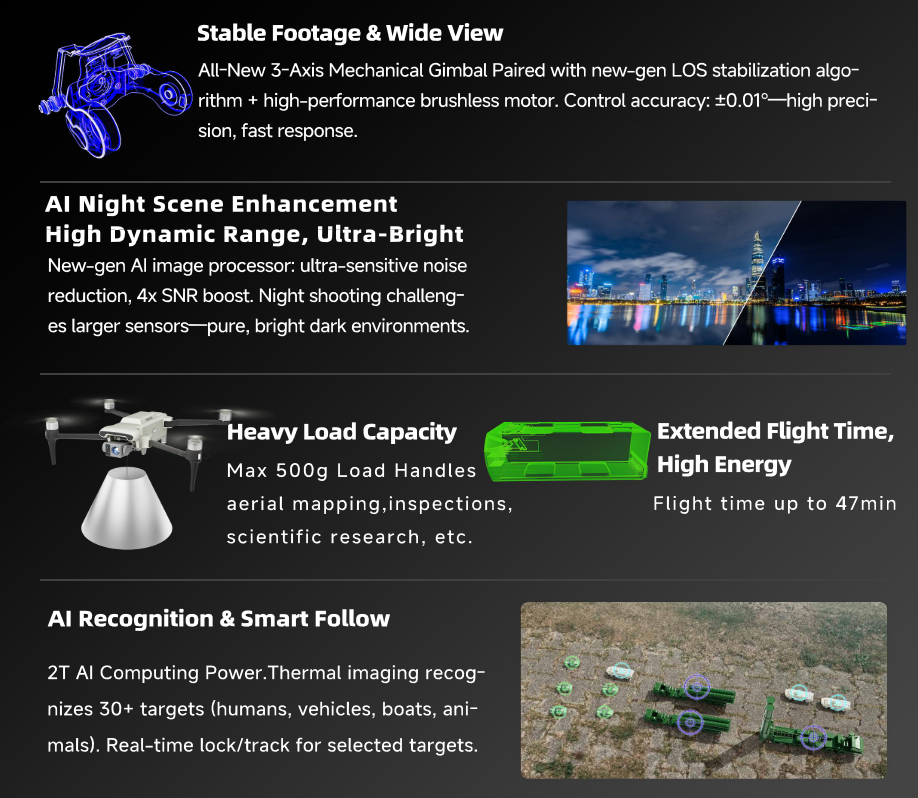 - ระบบ AI อัจฉริยะ: มีกำลังประมวลผล AI ถึง 2T สามารถจดจำเป้าหมายได้กว่า 30 ประเภท (เช่น คน, รถ, เรือ, สัตว์) และมีระบบติดตามเป้าหมายอัตโนมัติ (Smart Follow)